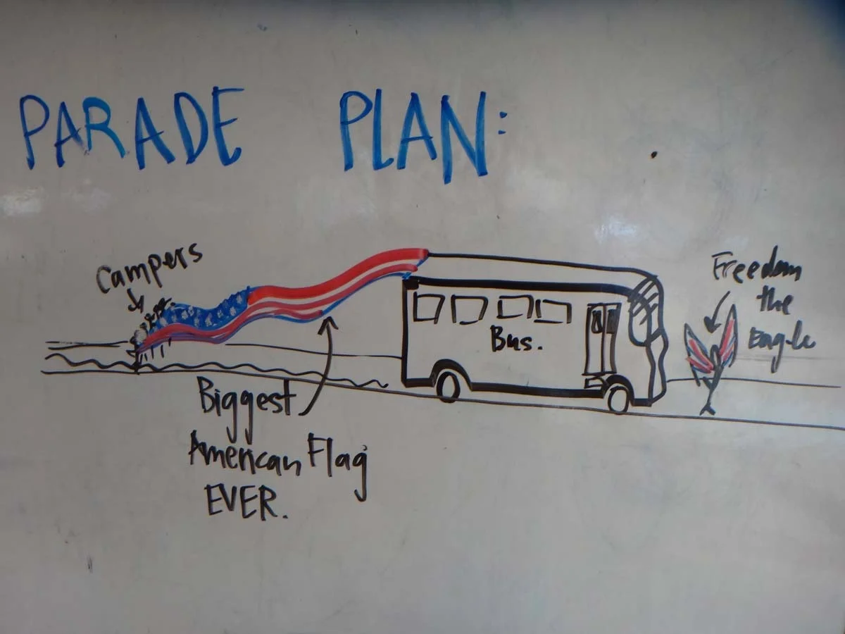This year, if we were going to go on down to Arroyo Seco and march in their iconic 4th of July Parade - by golly we were going to take home some prize money! But what theme should we choose for the float? The judges were looking for “Most Creative”, “Best Children's Entry," “Most Humorous," and “Best on Wheels." Every category was worth considering for our giant bus and its melting pot of young passengers; but we’re talking about the 4th of July here people! So of course we set our sights on “Most Patriotic."